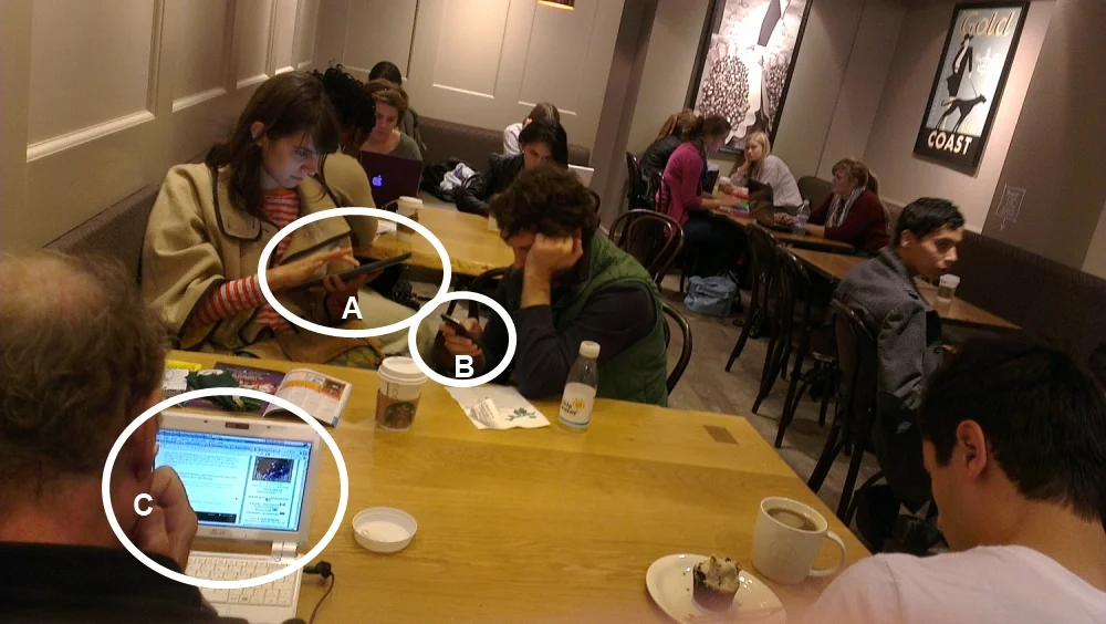 Just as 41% of phone usage is in the home, how much use of desktop occurs out of home? That I don’t know, but how often do we see people using their laptop in Starbucks and aren’t these individuals just as likely to benefit from locational services as someone using their mobile phone in the same setting? Why should brands assume user A, B and C in the image below all have different needs just because they are using different platforms?